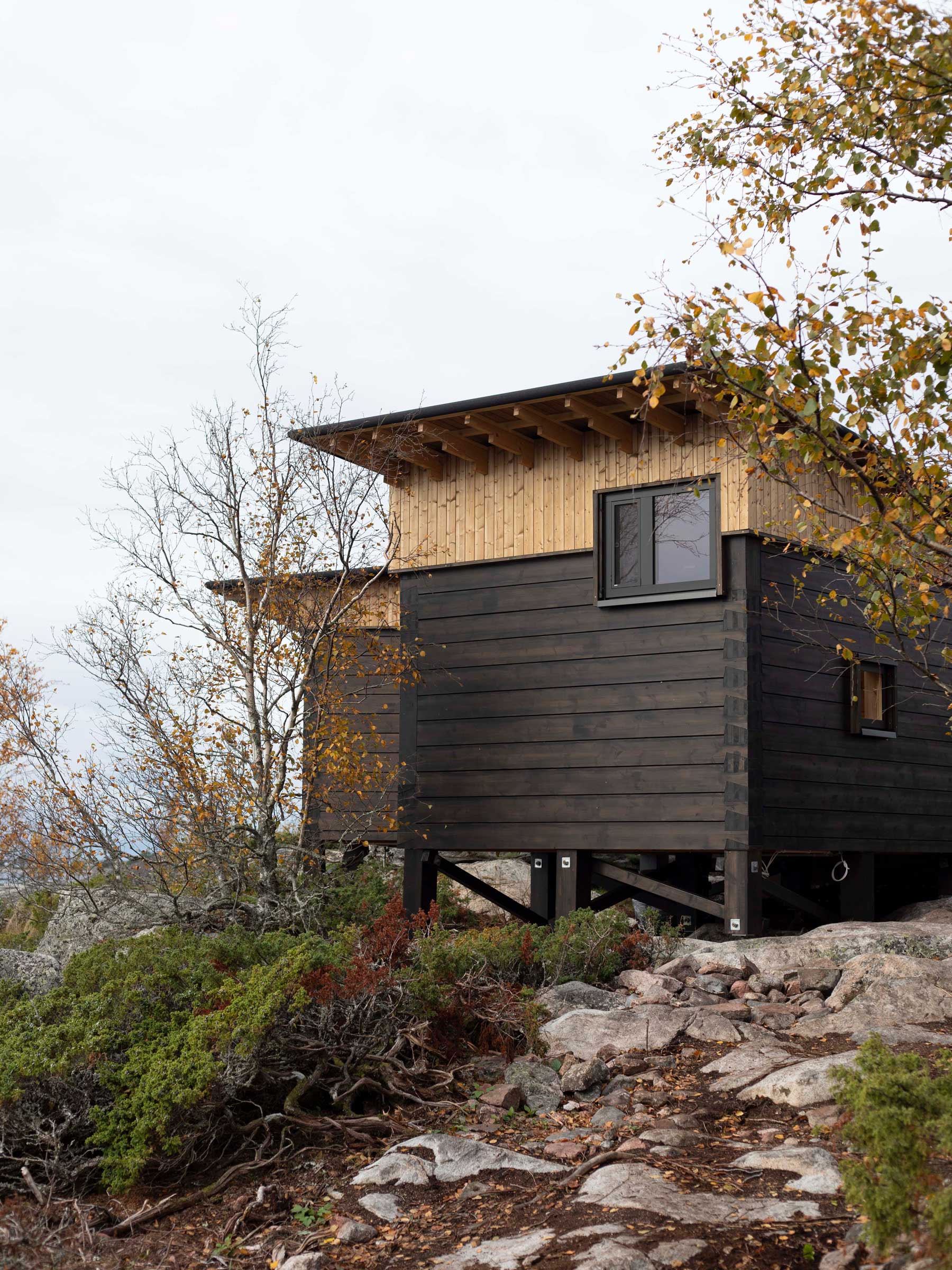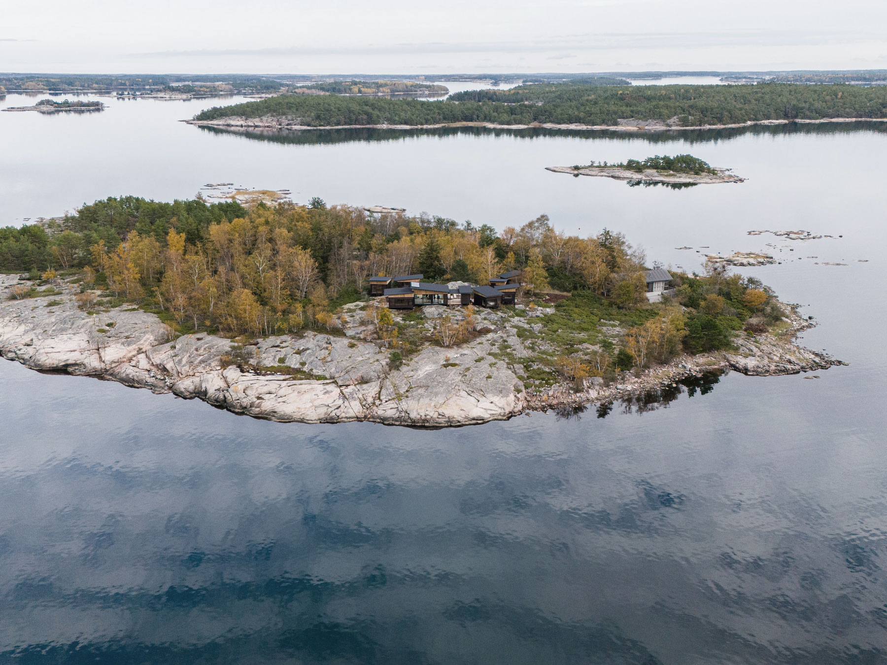 The cabin is located on a private island in the Finnish archipelago. A series of separate rooms are divided into small cabins scattered across the landscape. Together, they create intimate outdoor spaces and frame specific views of the surroundings. The project is a collaboration with Lundhagem.