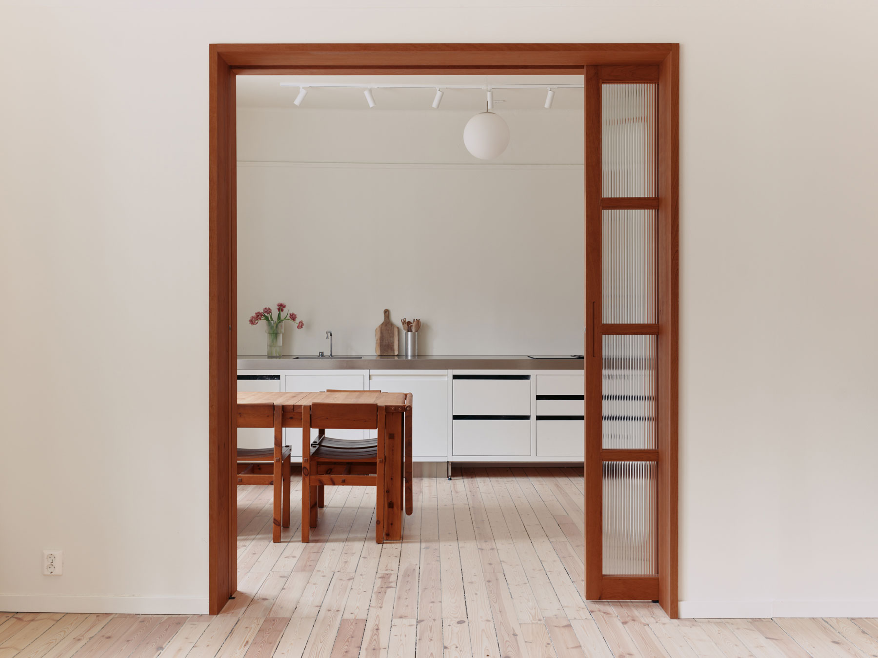 Custom elements in solid cherry and painted ash form the backbone of the interior. The kitchen, bathroom and fixed furniture are developed as a coherent set, giving the apartment a consistent material identity and a more unified spatial expression. Each piece is tailored to its position in the plan, allowing storage, transitions and daily use to be integrated rather than added on.