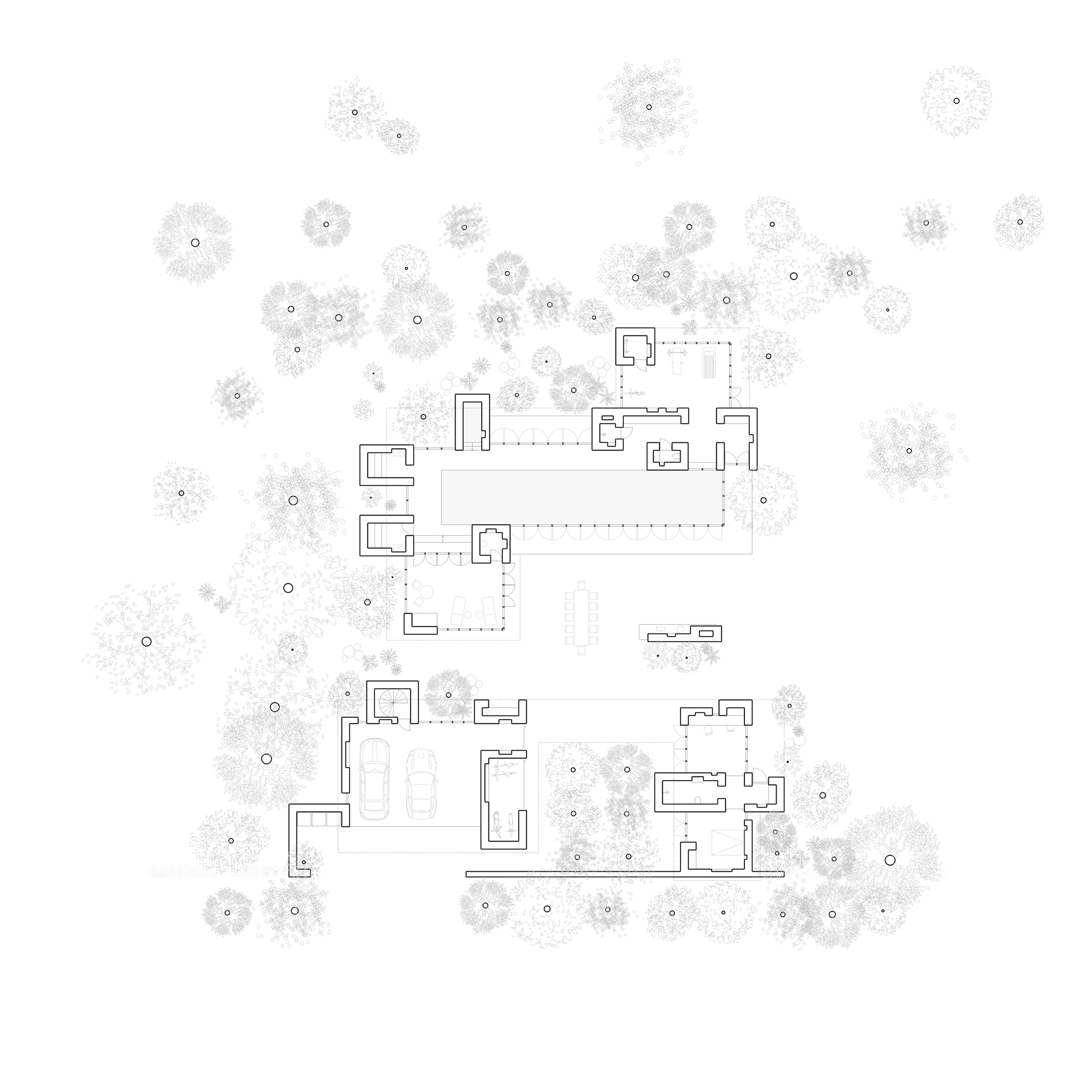 The project is composed of several low concrete buildings arranged around a pool and a garden. Each building volume has a clear function, such as gym, spa, lounge, garage, and guesthouse. The structures are connected by roof planes and open passages, allowing easy movement between them. Large openings provide direct contact with the garden, and existing vegetation is kept where possible. The layout is straightforward, functional, and designed for use throughout the year.